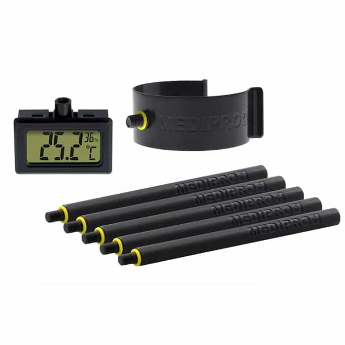 The Medipro marks off the required distance between your plants and lamp, with each stick in the modular system measuring 10cm (with 5 sticks in the set). Fit the heat resistant clip over the E40 light fitting of your reflector, with the right number of measuring sticks screwed onto it. Now you will reduce the risk of having your light fixture too close to your plants. A mini thermo hygrometer is also included and can be attached at the other end of the Garden HighPro MediPro to indicate temperature and humidity in the area of the leaf-tops.