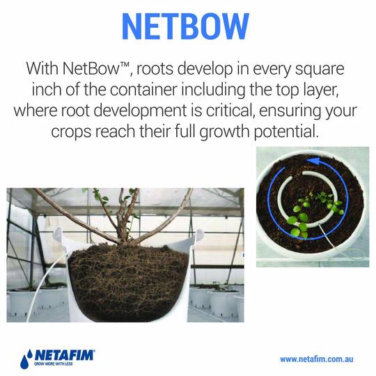 NetBow is an innovative, user friendly container irrigation multi-outlet dripper arc. NetBow was developed to address the needs of high-value soilless pot-irrigated crops such as blueberries and Cannabis, that require unique irrigation and fertigation knowhow.